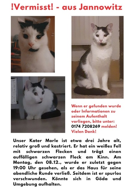 Wir vermissen seit dem 24.10.2025 unseren Kater Fritz. Er ist 1,5 Jahre alt und kastriert.Er wohnt in 02694 Quatitz. Hinweise bitte an Telefon: 0173 5826377 Familie Fischer