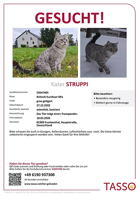 Wir können Sie bei der Suche nach Ihrem Familienmitglied unterstützen und benötigen von Ihnen dafür aber die Genehmigung zur Veröffentlichung der zugesendeten Fotos und Daten zum Tier und zu Ihnen. Ohne Ihre Zustimmung können wir auf unserer Homepage und in Facebook die Daten und Fotos nicht einstellen. Bitte informieren Sie uns auch, wenn Ihr Tier wieder da ist!