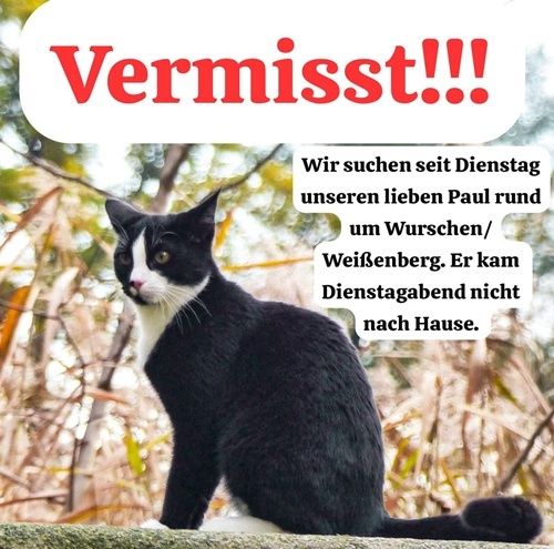 Unser lieber Paul wird seit Dienstag, den 29.7. vermisst. Letzter Sichtkontakt war 15 Uhr. Er wohnt in 02627 Wurschen auf dem Schlossplatz und kommt täglich nach Hause. Er ist kastriert und ein sehr freundliches, neugieriges Tier.